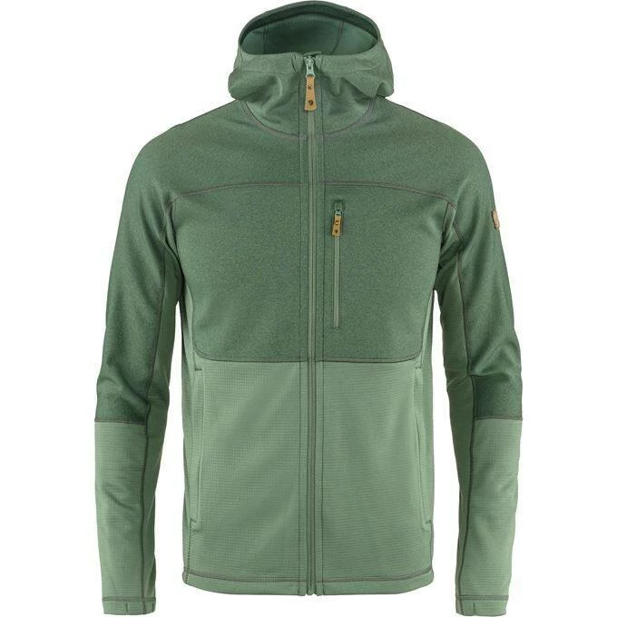 Light, convenient hooded sweater that combines two different fleece fabrics to warm where it is needed most and keep weight and packing volume down. The hood, shoulders and chest are made from flat-knitted polyester fleece (partially recycled) with a soft brushed inside, while the sides, lower torso and lower sleeves are in a lighter grid-structured fleece with superior ventilation. Perfect as a fast-drying and moisture-wicking mid layer on day trips or chilly summer evenings. Comfortable hood and one-way zipper in front opening. One chest pocket and two hand pockets, all with zippers.