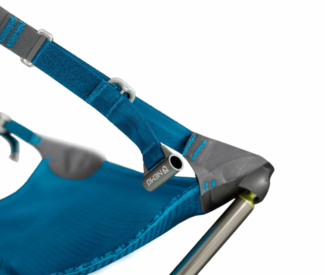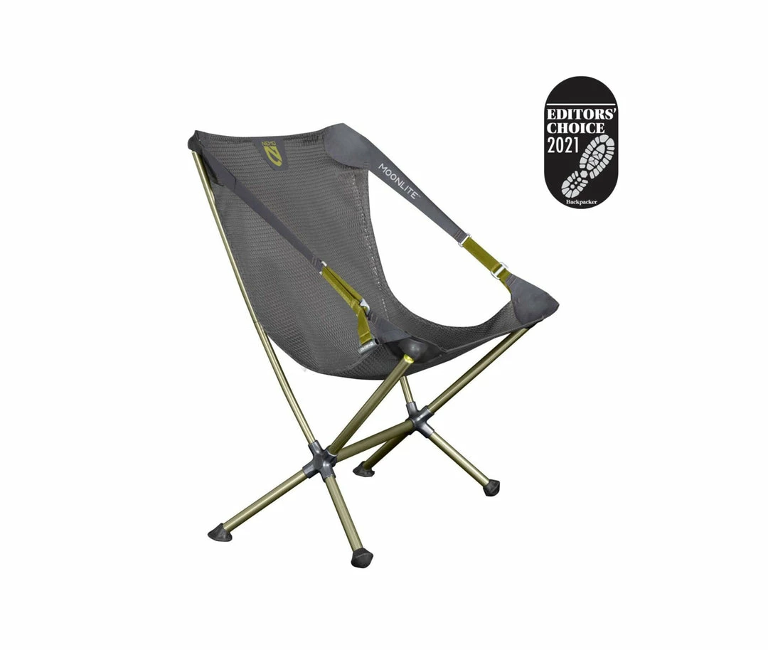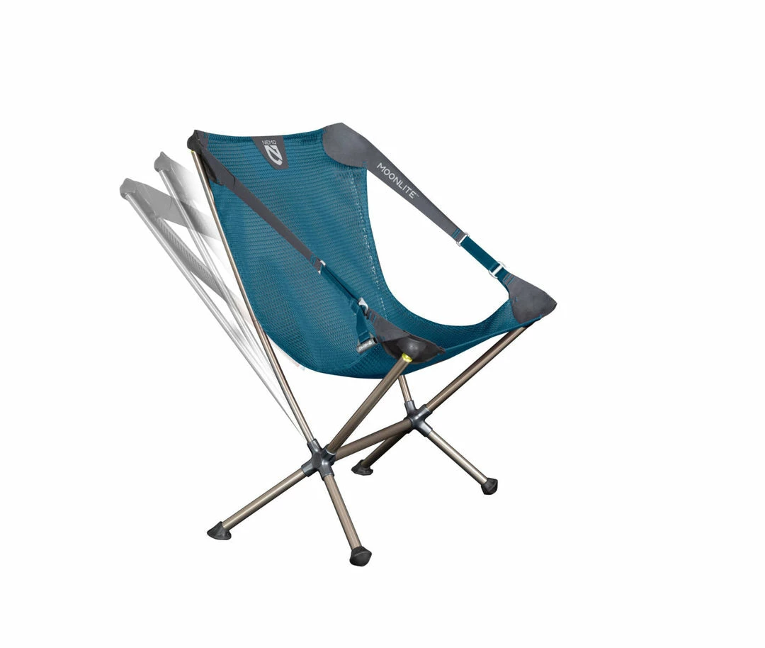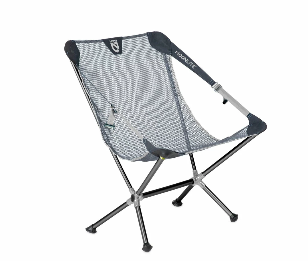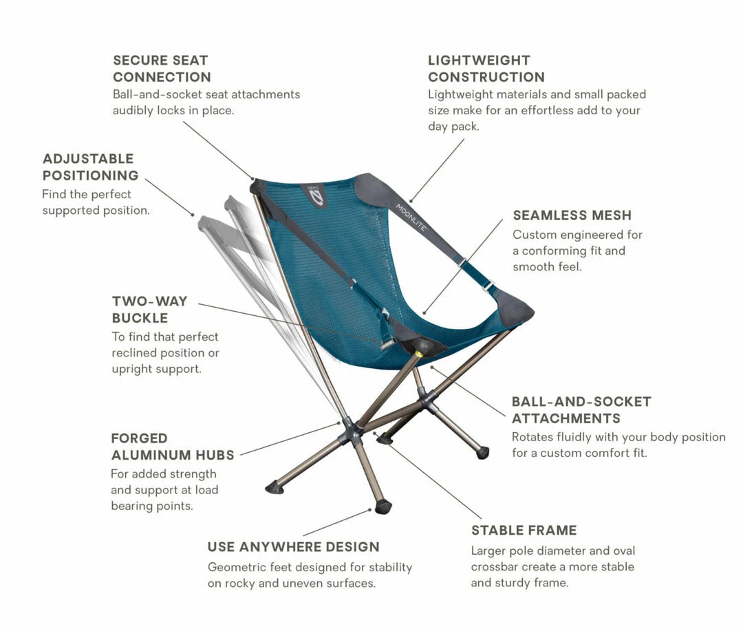 Take Moonlite™ into the backcountry and experience the feeling of weightlessness as you lean back under the stars. Easy to set up and barely noticeable in your pack, Moonlite™ is your go-to chair for every adventure from a picnic in the park to an extended backpacking adventure. Oversized tubes, paired with forged aluminum hubs, create exceptional strength and stability. And best of all, Moonlite is the only chair of its kind with an adjustable seating position, making it ideal for dining or reclining. The exceptional comfort of the Moonlite™ chair comes from a custom engineered, asymmetrical mesh that stretches to accommodate and support a variety of body types without needing seams. This unique seamless seat attaches to the frame with y molded, ball-and-socket connectors that rotate and align with your body to avoid uncomfortable pressure points. The adjustable seating position, oversized tubes, aluminum hubs and seamless seat combine to make a unique and transformative sitting experience in a packed weight and size that can come along for any adventure. True to our mission of sustainability, Moonlite™ uses 100% post-consumer recycled materials for the webbing and bluesign® approved mesh seat.
